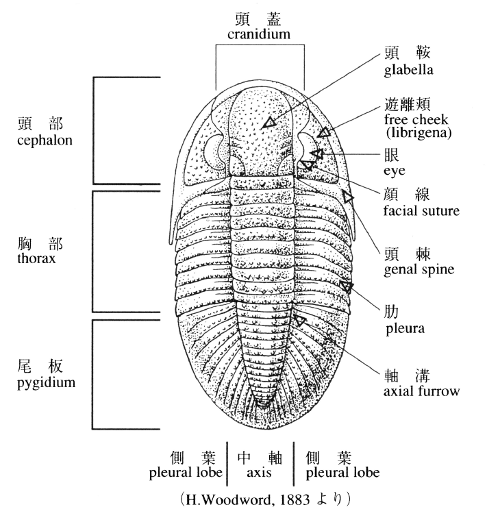 海生節足動物。多くは底生性。背甲は著しく石灰化しているが,腹面は上唇など頭部の一部の腹板を除いて石灰化しない。身体は頭部,胸部,尾部および軸部,両側葉部と縦横に三分化する。頭部は顔線(脱皮縫合線)を境に頭蓋と遊離頰に分かれる。頭蓋の中央の膨らみを頭鞍という。頭鞍はふつう横方向の頭鞍溝によりいくつかの頭鞍葉に分けられる。眼は複眼,ときに有柄眼。胸部の体節間のみ可動であり,身体を屈伸させるだけでなく,防御のために巻き込むことができた。腹部は複数の体節からなるが,尾板と呼ばれる腹部背板は可曲でない。頭部,胸部,尾部を通じて一様な2枝型の付属肢が生じるが,最前方の付属肢は1枝型で触角として機能。ふつう体長2~10cm,最大で75cm。カンブリア紀早期に出現し,カンブリア紀後期~オルドビス紀に最盛期を迎え,オルドビス紀末に激減,ペルム紀末に絶滅した。日本からもシルル紀以降の属種が多数産出する。