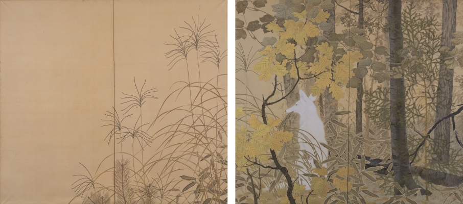 日本画家。本名晴三郎。和歌山市に生まれる。家は代々,紀州徳川家のお抱え能楽師であったが,明治維新後,父は篆刻(てんこく)や牙彫(げちよう)を業としていた。1881年一家が上京,観山ははじめ藤島常興,ついで狩野芳崖について絵を学び,北心斎東秀の号を名乗って少年時から天才を噂された。その後,橋本雅邦につき,さらに89年東京美術学校に入学。94年卒業と同時に同校助教授に任ぜられるが,98年岡倉天心が美術学校を辞して日本美術院を創立するに際し,橋本雅邦,横山大観らとともに母校を退き,美術院正員となる。以来,日本美術院が日本絵画協会と連合して開催した共進会に,洋風の陰影法と色彩感覚をとりいれた《闍維(じやい)》,大和絵研究に基づく《修羅道絵巻》,色彩によって空間を処理してゆく没線描法ともいうべき,いわゆる朦朧(もうろう)体の《大原の露》など,近代日本画の方向を暗示する作品を発表した。1903年ふたたび東京美術学校教授となり,文部省留学生として渡欧する。留学中は主としてロンドンで,ラファエル前派などの模写にとりくみ,洋風の写実における色彩の方法,人物像における表情などを研究した。05年帰国し,07年第1回文展に際して審査員に選ばれたが,自らも《木の間の秋》を出品,声価を得る。長く解散状態にあった日本美術院を,横山大観,安田靫彦らと苦難の末に再興,観山は《白狐》を出品した。続く第2回展には《弱法師(よろぼし)》を発表している。お抱え能楽師の家に生まれたことによるのか,その作風は静のうちに動勢を感じさせる一方,華麗な装飾美をあわせもち,ことにその描線の美しさをあげることができる。とりわけ前期の作品に秀れたものがあり,強い影響を後進に与えた。大正中期以降の秀れた作品としては《天心先生》《維摩黙然》,またモナ・リザの顔を模した《魚籃観音》などがある。なお17年,帝室技芸員に任ぜられている。