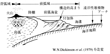 造山帯には付加作用で形成された地質体が多くあり、とくに日本列島のような、長期にわたって海洋プレートの沈み込みを受けた地域には、異なる時期による付加体が形成されている。古生代ペルム紀付加体の秋吉帯、中生代ジュラ紀の美濃(みの)‐丹波(たんば)帯、秩父帯北帯および三宝山(さんぼうさん)帯、中生代白亜紀から新生代古第三紀の四万十帯などは、その代表例である。これらの付加堆積物は、かつて地向斜堆積物とされたものである。地向斜・造山運動論は、プレートテクトニクスに基づく付加体説の登場によって、その役目を終えた。
