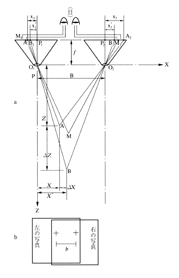 ΔX=B(x1/P-x1′/P′),ΔZ=f・m(P-P′)/b ただしmは写真縮尺の分母数,Bは撮影基線長,fは撮影カメラの焦点距離,bは図bのように左右の写真の主点間距離である。視差の測定では実体視とメスマーク(図aのM1とM2)が重要な役割を演ずる。写真測量の方法としては空中三角測量・射線法・図化・偏位修正等の技術がある。写真測量は空中写真測量と地上写真測量に分類される。前者は空中写真による写真測量で,主として地図をつくる目的に使われる。後者は今日では主として応用測量の分野で活躍している。地上測量の一種として物体を近距離で撮影して測定を行う近距離写真測量があり,工業・医学・応用科学等の各種の面での測定に利用されている。写真判読は写真から情報を読み取るための技術で,地理・地質・考古学等から鉱物資源開発,あるいは軍事目的まで広範囲の分野でその技術が使われている。参考文献:Morris ed.(1966)Manual of Photogrammetry. Vol.1, Vol.2, American Society of Photogrammetry