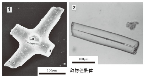 土壌や地層中の骨片は,その起源,化学性,鉱物学的特徴から動物珪酸体(宇津川徹ほか,1979)という。動物珪酸体の出現は,現地性由来のもの(地層の生成環境の推定),異地性由来のもの(古砂丘やレス),考古遺物(土器胎土)などから情報が得られる。微化石として生物起源の海綿動物の骨片は,陸成層・沿岸成層・海成層および淡水成層中で検出されている。従来,地質学の分野で,部分化石はチャートの生成や環境復元に利用された。イギリスのF. Smithson(1959)が土壌中から海綿動物起源の珪質(Opal)骨片を検出して以来,日本の第四紀層などで確認された。珪質骨片・骨針(opal sponge spiculesと呼ぶ)は非結晶質の珪酸体で,形状は分類群によって異なる。海綿の骨格は生物学的に主大骨片と微小骨片とに分けられる。主大骨片は一軸型・三軸型・四軸型・多軸型があり,微小骨片は星状体・シグマ体などが認められる。写真は,テフラ中の動物珪酸体の骨片(①走査電子顕微鏡の骨片,②光学顕微鏡の骨片で中央に管が見られる)。参考文献:宇津川徹ほか(1979)ペドロジスト,23巻:30