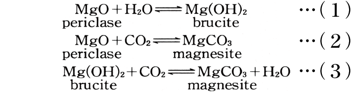 を引くことができる。これらの反応の平衡条件は,μMgO+μH2O=μMg(OH)2,μMgO+μCO2=μMgCO3およびμMg(OH)2+μCO2=μMgCO3+μH2Oであるので,化学反応(1),(2),(3)の平衡曲線の傾きdμH2O/dμCO2はそれぞれ,0,∞,1となる。