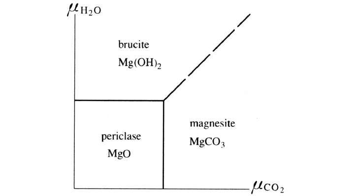 開いた系について,完全移動成分の化学ポテンシャルを座標軸にとり鉱物共生を示した図。コルジンスキーの化学ポテンシャル図とも。固定成分がMgOで完全移動成分がH2OとCO2である場合を例にとると,MgO-H2O-CO2系に出現する鉱物はペリクレース(MgO),ブルーサイト(Mg(OH)2),マグネサイト(MgCO3)である。これら3相が共生する場合,完全移動成分の化学ポテンシャルμH2OとμCO2はある決まった値になり,化学ポテンシャル図上の1点Aで表される。この定点Aから2相が共存する平衡曲線: