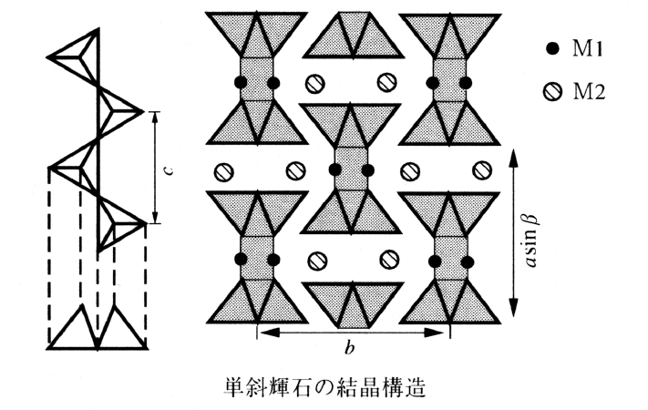 …そのようなSiO4よりなる鎖と鎖の間にMg2+,Fe2+,Ca2+その他の陽イオンが入って鎖を互いに結びつけている。輝石には斜方晶系に属する斜方輝石と単斜晶系に属する単斜輝石とがある。