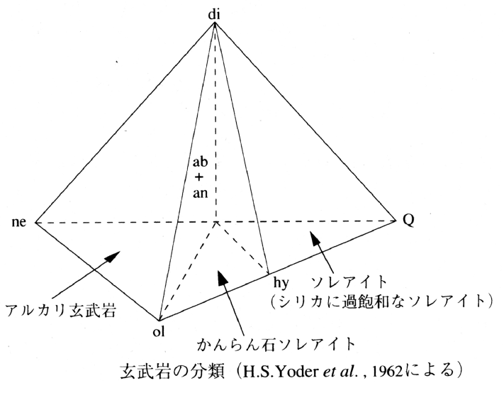 透輝石-苦土かんらん石-かすみ石-石英系は玄武岩のすべての主な鉱物(相)の成分(component)を含んでいるので,この系を単純玄武岩系(ただし,鉄が含まれていない)と呼ぶ。あるいは,玄武岩の分析値からCIPWノルムを計算すると,多くの場合,ノルム鉱物の大部分は単斜輝石-かんらん石-かすみ石-石英系のなかに含まれるので,この系を単純玄武岩系と呼ぶこともある(H.S.Yoder et al.,1962)。後者のほうが利用価値が高く,玄武岩の分類に使われている。すなわち,この四面体をさらに三つの小四面体に分解し,単斜輝石-斜長石-直方輝石-石英四面体(SiO2に過飽和)に入る玄武岩をソレアイト,単斜輝石-斜長石-かんらん石-直方輝石四面体(SiO2に飽和)に入るものをかんらん石ソレアイト,単斜輝石-斜長石-かんらん石-かすみ石四面体(SiO2に不飽和)に入るものをアルカリ玄武岩と分類している。玄武岩質マグマの低圧での結晶作用では,マグマは単斜輝石-斜長石-かんらん石がつくる面を越えて,一方から他方へ移ることはできない。この面を熱障壁(thermal barrier)と呼ぶ。ただし,この熱障壁は高圧下では消滅する。
