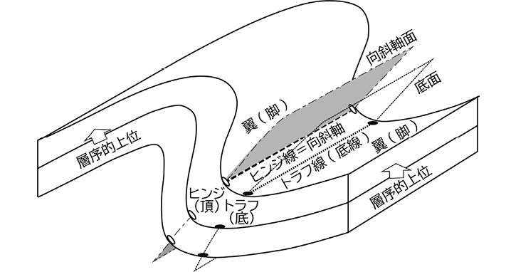 水平面を基準として上方に凸面を向けた褶曲を背斜状構造antiformといい,逆の場合を向斜状構造synformと呼ぶ。一方,褶曲の姿勢とは無関係に,褶曲の内側に向かって順次より古い地層が存在する褶曲を背斜anticlineといい,逆により新しい地層が見いだされるものを向斜synclineという(図1)。…