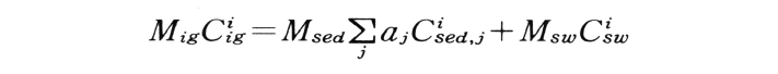ただし,MigおよびCiigはそれぞれ風化された大陸地殻中の火成岩の全量および元素iの濃度,MsedおよびCised,jは現在の地球上の各種堆積岩j(海洋底堆積物を含む)の全量および元素iの濃度,MswおよびCiswは海水の全量および元素iの濃度,ajは異なった種類の堆積岩および海洋底堆積物の相対的存在度である。多くの元素についてバランスが成り立っており,各リザーバーの化学組成は定常状態にあると考えてよい。場合によってもっと小さなリザーバーを想定することができる。