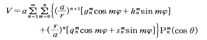 と表される。ガウスが1830年代に球関数を用いて地球磁場を展開して以来,この表現が頻繁に用いられている。上式でgmn, hmn, qmn, smnはガウス係数(Gauss coefficient)と呼ばれ磁場と同じ次元をもつ。ガウス係数のうち,qmn, smnは外部起原の磁場の強さを表し,gmn, hmnは内部起原の磁場の強さを表す。Pmnはn階m次のルジャンドル陪関数Pn,mにシュミットが定義した係数を次式のように掛けたもので,