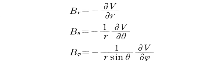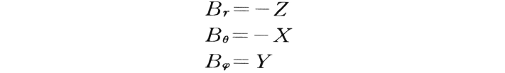 と求まる。地球を完全な球と考えればBの各成分は地磁気三成分X, Y, Zと
