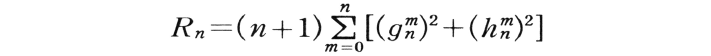 の関係をもつ。したがって,ガウス係数を用いて地球上の任意の点における地磁気三成分を計算することができる。また,ガウス係数を用いてn階の内部磁場強度の2乗平均Rn