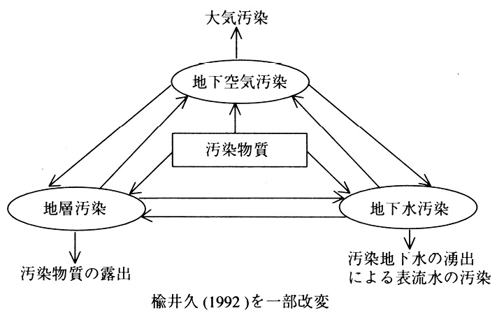 地質体がなんらかの人間の行為によって汚染されていくこと,またはその状態。地下は,固体である地層粒子,液体である地下水,気体である地下空気から構成される。汚染物質が地中に投入されると地層粒子が汚染され(地層汚染),同時に粒子間隙の地下空気が汚染され(地下空気汚染),さらに地下水面下に達すると地下水が汚染され(地下水汚染)ていく。これらをまとめて地質汚染という。人工地層では,地層粒子そのものに有害物質を含むものもある。汚染物質が揮発性のときには,これら三者は互いに関連しながら汚染が進んでいくので,例えば地下水汚染だけを一面的にとらえた対策を行っても浄化は成功しない。汚染現場周辺の正確かつ詳細な水文地質構造と,透水層ごとの汚染物質の移流状況を明らかにし,汚染の侵入から現状までの状況を復元する機構解明を行いながら対策を進めることが効果的・効率的な浄化にとって必要である。参考文献:水収支研究グループ編(1993)地下水資源・環境論,共立出版