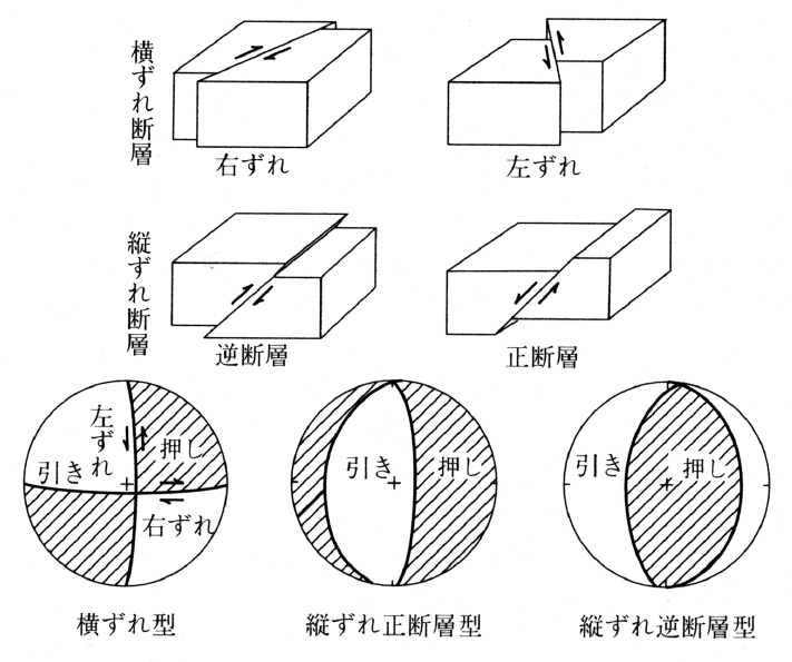 地震波を励起する力源の記述。震源を地下の断層運動と考えるときは,断層面の向きとすべりの方向を記述することに対応する。地震のメカニズム解は,しばしば図にあるような形で表示される。放射される波の分布は震源に関して対称になるので,震源球(震源を囲む球面)の半分を示すだけで震源メカニズムを表示できる。図では,震源球の下半球を平面に投影している。震源球の中心から下方の斜線をつけた方向へ出ていく波は押しの成分をもっており,斜線なしの方向へ出ていく波は引きの成分をもっている。地震が単純で,一枚の断層平面でのすべりだけの場合は,震源球上での押し引きの分布は,球の中心を通る2枚の直交面で四つの象限に区切られる。この2枚の平面のうちの一つが実際の断層面になり,他の面はすべり方向に垂直な面となる。すべりの向きは斜線なし(引き)の象限から斜線有り(押し)の象限へと向かう。1枚の断層面上でのすべりと同じ地震波を放出する力の組合せをダブルカップルと呼ぶ。押し引きの分布が曲面で分けられている場合は,地震は,1枚の断層だけでは説明できない。このような場合,震源は非ダブルカップル成分を含むという。非ダブルカップル成分まで含む地震のメカニズムは,モーメント・テンソルによって一般的に記述される。個々の地震のメカニズム解からわかるのは,地震の発生により解放される歪みであり,震源域に加わっている応力場でないことは注意を要する。