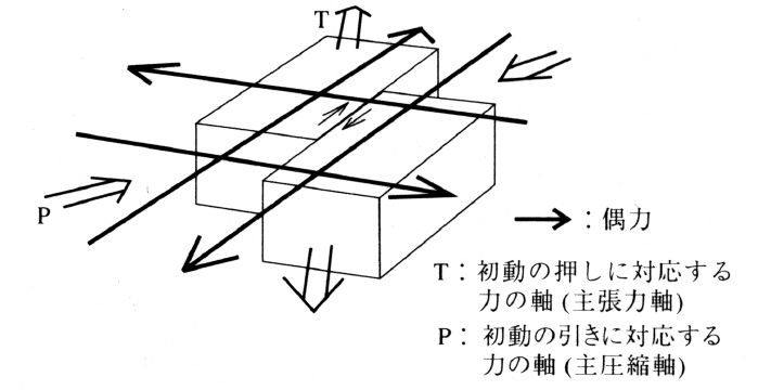 P波とS波の初動の押し引き分布からも支持される地震発生に関する弾性反発説によると,地震波を放出させる波源としての震源は,図のように2組の偶力が震源周囲で働くという力学系で表すことができる。この力学系をダブルカップルといい,その強さを一方の偶力のもつモーメントで表し,これを地震のモーメント(M0)と呼ぶ。転位理論によると,このM0は,M0=μDSで表すことができる。ここで,μは岩石の剛性率,Dは断層面沿いの平均変位量,Sは変位した断層面積である。環太平洋地震帯のなかで,南米,アラスカ,アリューシャン列島などの地域に起こる巨大地震のなかには非常に大きなM0をもつ地震があり,これらの地震は,従来のように,周期20sec前後の表面波の最大地動振幅から決められるマグニチュードMsでは,地震のスケールの大小が区別できないため,新たに,M0から地震のエネルギーを算出し,それをグーテンベルク-リヒターの式に入れてマグニチュードを出す(この値をMWと書く)という方法がとられるようになった。この方法によると,例えば1960年のチリ地震(Ms=8.5)のM0=2.7×1023N・mで,MWは9.5となり,これまでで最大規模の地震となる。参考文献:H.Kanamori(1977) J.Geoph.Res.,Vol.82:2895