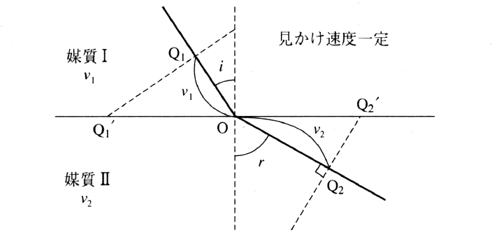 媒質の変化に応じて進行方向が変化する波動。波の進行方向に関しては屈折の法則(またはスネルの法則)が成り立つ。すなわち媒質Ⅰ(速度v1)から媒質Ⅱ(速度v2)へ入射角iで入ってきた波が屈折角γで媒質Ⅱへ進むとすると,sin i/v1=sin r/v2が成り立つ。また媒体ⅠとⅡの境界に沿って水平方向に伝播する波をヘッドウエーブという。