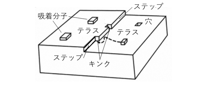 ステップの前進による結晶の成長。1920年代頃からVolmer, Kossel, Stranskiらによって提唱された。成長中の結晶面は,平坦なテラス,ステップ,ステップの折れ曲がった箇所であるキンク,穴,吸着分子などで構成されている。吸着分子はテラス上を拡散した後,3面で結合できるキンクに取り込まれる。その繰り返しによってステップは前進する。継続的に結晶が成長するには,テラス上に二次元核を形成する必要がある。すなわち,層成長によって結晶を成長させるには,二次元核が形成する程度の過飽和度条件が必要である。一方,渦巻成長であれば低下飽和条件でも結晶は継続的に成長できる。
