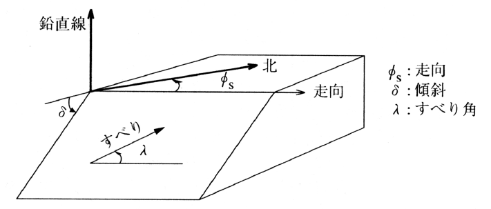 震源断層を記述する物理量。断層面と食違い(すべり)の方向は,図のように,走向φs,傾斜δ,すべり角λの三つの角度で表される。傾斜角の範囲を0≦δ≦90°とし,断層の下盤側に対する上盤側のずれをすべり方向とする。断層の大きさを表す量として断層面積Sと食違いDがある。断層面を長方形で近似する場合には長辺,短辺をそれぞれ長さ,幅という。震源全体の大きさを表す量として地震モーメント(M0)があり,M0=μDS(μは剛性率)の関係がある。断層の運動過程を表す物理量として,破壊フロントの伝播速度(破壊速度),食違いの継続時間(ライズタイムτ),食違い速度(D/τ)などがある。これらのパラメーターは地震波の放射パターンや波形,余震分布などから推定される。