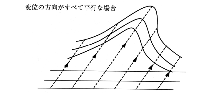 (2)横曲げ褶曲または座屈褶曲にかかわらず,地層の厚さに変化がなく,層面すべりなども伴わない褶曲について用いられることもある。その場合,湾曲の内側が圧縮場,外側が引張場となる。