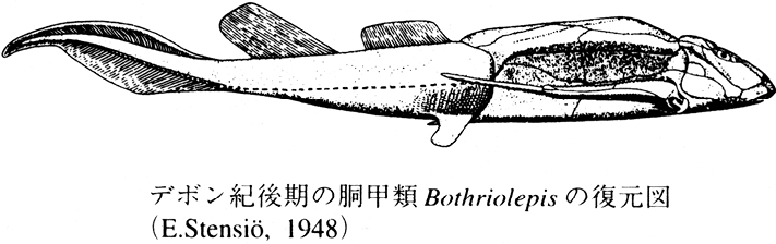 脊索(せきさく)動物門Chordata、脊椎(せきつい)動物亜門Vertebrataあるいは頭蓋(とうがい)亜門Craniata、顎口(がっこう)上綱Gnathostomataに属する化石魚類の総称。あごをもった魚類としてもっとも古く、古生代上シルル紀からデボン紀にかけて出現し、デボン紀から石炭紀に栄え、2億8000万年余り前のペルム紀(二畳紀)に滅亡した。デボン紀の中ごろまでは淡水で生活をしていたが、その後は海洋へも進出した。しかしデボン紀の終わりごろ、急に軟骨魚類にとってかわった。体は底生生活に適応し、縦扁(じゅうへん)したものが多い。外敵から身を守るため、体の前半部または大部分が頑丈な骨板で包まれており、尾びれや背びれ、臀(しり)びれのほかに、未発達ながら胸びれや腹びれをもつようになった。