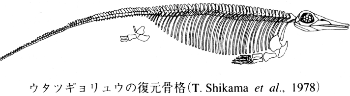 1970年宮城県本吉郡歌津町(現,南三陸町)館崎の海岸にみられる三畳紀初期の黒色ケツ岩層より発見された爬虫類。ここからは10個体分が産出した。全長1.4mで,細長いイルカ形をしている。尾は不等形。頭は短く,吻部(ふんぶ)が突出している。眼輪をもつ。細い円筒形の歯が並列する。肩甲骨と烏口骨は扇形。上腕骨など四肢骨は原始的といわれる。前肢の指骨は細長いのが特徴。後肢は小さい。世界でもっとも原始的な魚竜と考えられている。