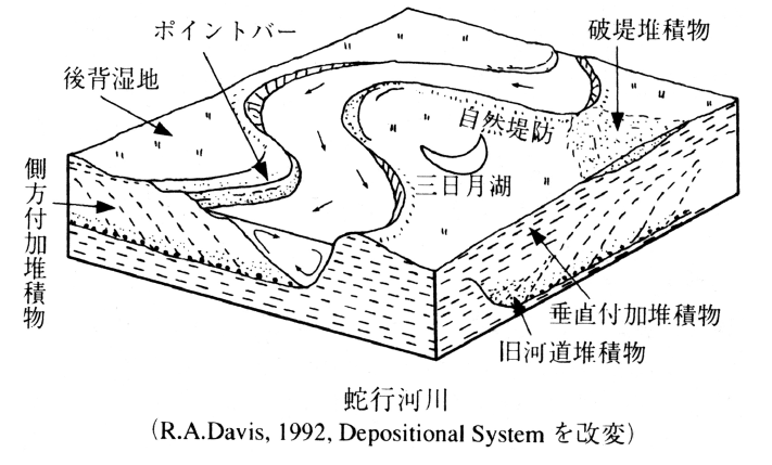 河川の堆積作用により扇状地・自然堤防帯・三角州に形成された堆積物の総称。河(川)成層とも。代表的な河川堆積物として,蛇行および網状河川堆積物が挙げられるが,両者の中間的な性質をもつものも多い。蛇行河川では,堆積環境によって次のような堆積物が形成される。1)流路堆積物:流路残留堆積物,ポイントバー堆積物,中州堆積物。2)氾濫堆積物:微低地埋積堆積物,自然堤防堆積物,破堤堆積物,氾濫原堆積物。3)中間的堆積物:流路埋積堆積物。網状河川は,一般に蛇行河川よりも急勾配で岩屑を多量に運搬し,砂礫からなる島や中州によって網の目状に分岐・合流を繰り返す。網状河川堆積物は,砂礫堆とその間を埋める砂泥などの細粒堆積物からなる。堆積物の上方細粒化が認められ,大型斜交層理の発達する大・中礫層から始まり,斜交層理・平行葉理・リップルドリフト斜交葉理の砂質堆積物,最上部の泥層と重なる。