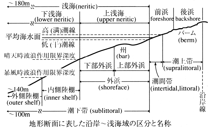 …平均的な高潮位と低潮位に対応する汀線を,それぞれ高潮(汀)線,低潮(汀)線といい,両者によって挟まれる地帯を潮間帯という。高潮線より内陸側も波浪,とくに暴風時の波浪によって影響を受けるので,低潮線と波浪の作用の及ぶ陸の限界の間を海浜sea shoreまたは単に浜shoreとよぶ。海浜は前浜(低潮線と高潮線の間)と後浜(高潮線より陸側)に区分され,後浜の陸側の限界を広義の海岸線shore lineまたは沿岸線coastlineとよぶ。…