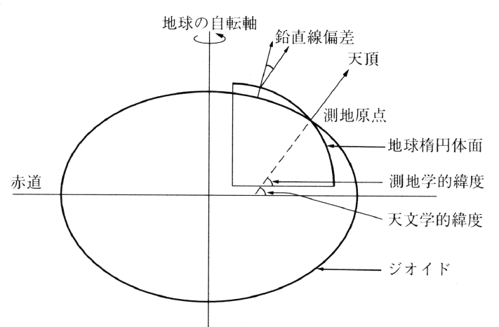 地球上の各点の位置を緯度・経度で表すため、それらの点を投影する基準面として採用された、地球楕円体(地球に非常に近い形をした回転楕円体)。古典的には、原点にとったある1点での法線がその点でのジオイドの法線、つまり重力の方向と一致するようにとるが、他の点ではかならずしもジオイド面と一致しない。楕円の長半径、短半径には各種のものがあり、日本では明治以来、ベッセルが定めた楕円体を採用していた。世界測地系を測量の基準とする測量法改正(2001)に伴い、2002年(平成14)からは国際的な決定に基づく「GRS80(Geodetic Reference System 1980)楕円体」を準拠楕円体として採用している。