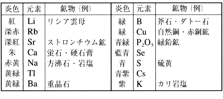 ある特定の元素または塩類を無色の炎の中に入れて熱すると,それぞれに特有の色を示す。これは金属の蒸気が熱せられて発する輝線スペクトルのうち,ある波長の光が特に強いために生ずる現象で,元素検出のための定性分析として利用される。塩酸をつけて強熱することを繰り返して清浄にした白金線をさらに塩酸に湿し,その先に鉱物粉末を少量つけて,炎の低温部から高温部に移して炎色を観察する。その際,直視分光器・フィルター用色ガラスを用いることもある。