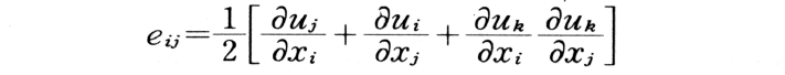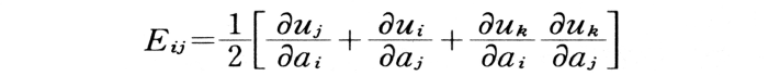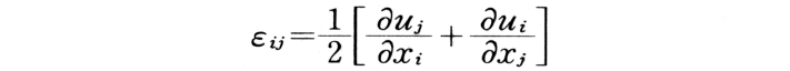 により定義される。EijはGreenまたはLagrangeの歪みテンソル,eijはAlmansiまたはEulerの歪みテンソルと呼ばれる。変位uiの成分の1階の導関数が十分小さく,uiの偏導関数の平方や積が無視できるという無限小歪みの仮定を導入すると,Eijとeijは一致し,コーシー(Cauchy)の無限小(微小)歪みテンソル
