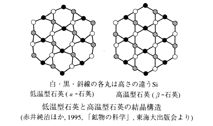 化学組成SiO2。石英には低温型石英(α-石英)と高温型石英(β-石英)があり,1気圧の圧力のもとで低温型は約573℃まで安定で,高温型は約573℃から870℃まで安定である。天然に産する石英はすべて低温型である。火山岩のなかには高温型の結晶形を示すものもあるが,これも現在は低温型に転移している。なお,石英の結晶を一般に水晶と呼ぶ。
