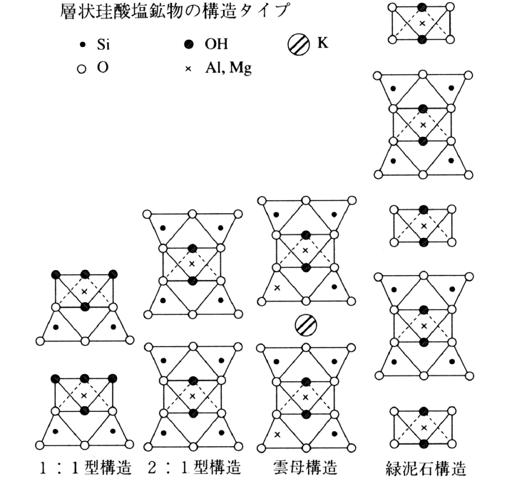 粘土の構成鉱物。含水珪酸塩鉱物であり,層状結晶構造を有するものが大部分である。大きなサイズの結晶は一般に存在しない。四面体シートと八面体シートがそれぞれ1枚ずつからなる1:1型層状構造を有する粘土鉱物には,カオリン鉱物・蛇紋石鉱物があり,四面体シート2枚と八面体シート1枚の組合せからなる2:1型層状構造を有するものには,パイロフィライト・滑石・スメクタイトグループ・バーミキュライト・雲母・脆雲母がある。2:1型の珪酸塩層の層間に,さらに1枚の八面体シートが挟まった層構造をもつ2:1:1型のものには,緑泥石族がある。その他レクトライト・コレンサイト・トスダイトなどの混合層鉱物,セピオライト・パリゴルスキー石などの層状珪酸塩の変種,イモゴライトやアロフェンなどの準結晶質あるいは非晶質粘土鉱物がある。
