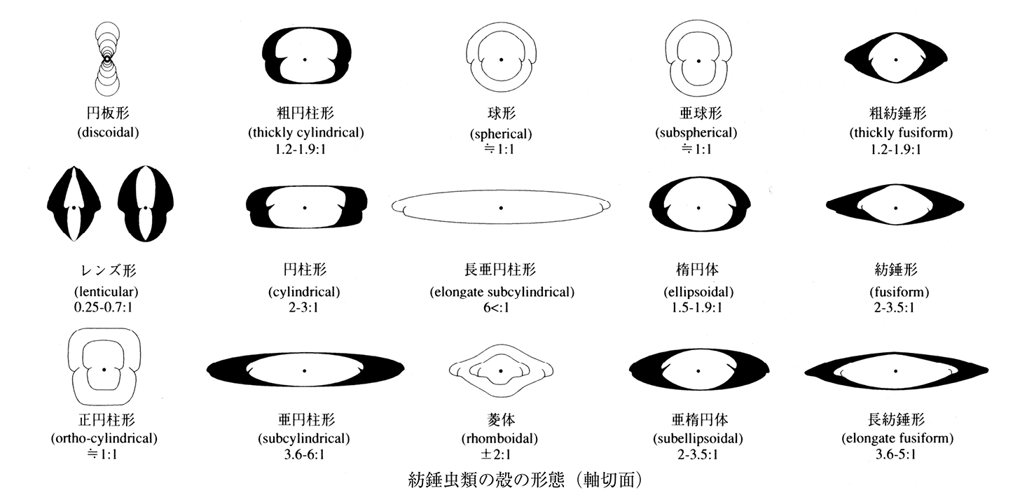 有孔虫類に属する。フズリナ類とも。石炭紀前期に繁栄した小型有孔虫(Endothyrida)から進化し,石炭紀後期に入って急速な形態発達に伴って,100属以上,約5,000種にも及ぶ多くの種属に分化し,ペルム紀末に絶滅。その進化過程では次のような形態の変化が認められる。1)殻が小さいもの(数百µm)から大きなもの(数cm)に変化。2)旋回軸が短いものから長いものへと変化(扁豆形から紡錘形への変化)。3)殻壁の未分化層から分化層への発達。4)隔壁の褶曲の複雑化,または格子構造への分化。5)二次的沈殿物(コマータ,準コマータ)の分化。紡錘虫類の大多数の属は,オーストラリア・南極大陸を除くほとんどすべての大陸から産出。したがって,その生息圏はユーラシア・米国の大地向斜地帯およびそれに近接する地向斜群のほとんど大部分の海域に及んでいた。古生代後期の有効な示準化石。紡錘虫の生息区(動物地理区)は,いくつかに分けられるとはいえ,世界的対比上価値のある紡錘虫化石帯が設定されて,各地域相互の階・亜階単位での対比を容易にしている。また,しばしばサンゴ・石灰藻とともに浅海炭酸塩堆積物から発見されるので,示相化石としても有効といえよう。