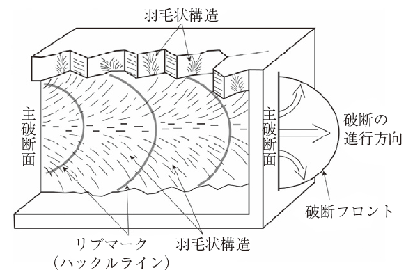 硬結な岩石の破断面に見られる,羽根の筋(plumose)のように,対象的に両側に開いた配列を示す構造。破断が一点から進行方向へ伝播したときに形成したと考えられ,筋に直交する破断フロントに沿って伸長割れ目(タイプI)が急激な破壊として伝播したことを示すとされる。円弧状ないし同心円状の段差(リブマーク,ハックルライン)を伴う。本構造は多くの伸長節理の面に見られることから,伸長割れ目(引っ張り割れ目)に特徴的な構造である。