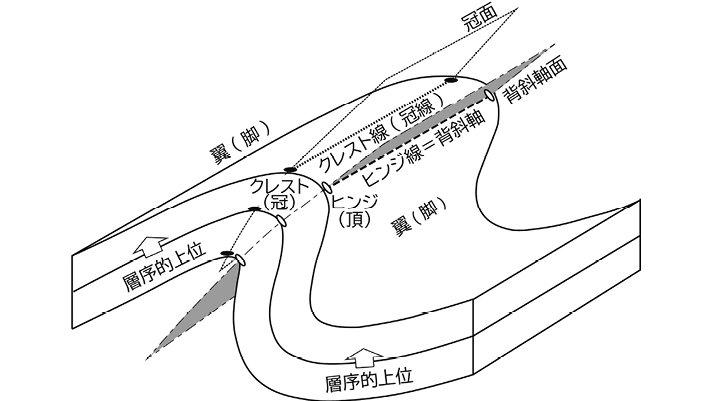 水平面を基準として上方に凸面を向けた褶曲を背斜状構造antiformといい,逆の場合を向斜状構造synformと呼ぶ。一方,褶曲の姿勢とは無関係に,褶曲の内側に向かって順次より古い地層が存在する褶曲を背斜anticlineといい,逆により新しい地層が見いだされるものを向斜synclineという(図1)。…