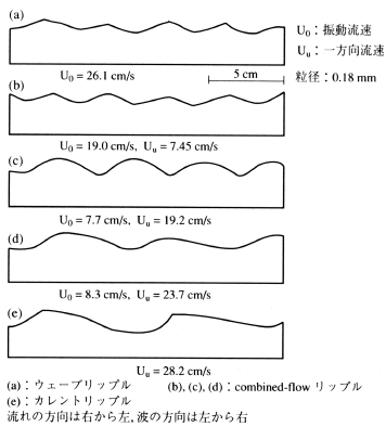 波と流れが同時に作用する複合流によって形成されるリップル。上流側斜面も下流側斜面も上に凸でクレスト全体が丸い。トラフも下に凸で丸い。この特徴は一方向流成分がある程度大きくなると現れ,一方向流速が相対的に大きいほど顕著になる。一方向流成分が小さい場合はウェーブリップルとほぼ同じ形態を示す。堆積構造は上に凸の丸いフォアセット葉理が特徴。外浜~内側陸棚のストーム堆積物や沿岸域・陸棚の潮汐堆積物に多くみられる。combined-flow rippleという呼称は,J.C.Harms(1969)による。asymmetric wave-related ripple marks, combined wave-current ripplesなども同義。