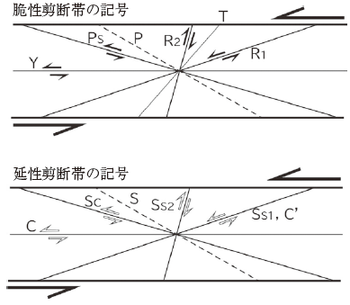 テクトナイトに認められる異なる姿勢を示す複数の面構造。通常,剪断を被ったマイロナイトや葉片状断層ガウジなどに発達する。マイロナイト中にはS面・C面・C′面(Ss面)(シアバンド),葉片状断層ガウジにはP面・Y面・リーデルシア(R1面, R2面)などが複合面構造として存在する。複合面構造の交線は剪断運動の方向と直交し,その斜交関係は剪断のセンスの決定に役立つ重要な運動論的指標となる。