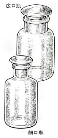 化学薬品の保存、運搬に使われる容器。透明ガラス、着色ガラス、合成樹脂などが主要な材質で、液体薬品には細口瓶、固体薬品には広口瓶を使うのが普通である。不純物の混入や内容物の漏れを防ぐため、差込みあるいはねじ込みの栓をする。5ミリリットルから5リットルくらいまで、容量の種類も多いが、俗にポンド瓶とよばれる約0.5リットル容量のものと、オンス瓶とよばれる約25ミリリットル容量のものが多用されている。