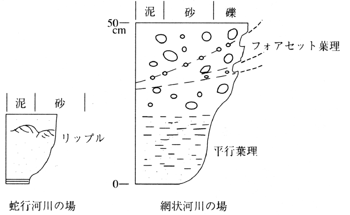 単層内において,砕屑物が下底面から上に向かって粗粒化する成層状態。特に,河川の自然堤防などの微高地に堆積した洪水氾濫堆積物に普遍的。茨城県桜川で初めて認められ,その後日本のさまざまな規模の現世河川と第四系中で発見されている。世界の河川での報告例はまれ。蛇行河川(自然堤防帯)の場では,層理は基底のシルトに始まり,上方にしだいに粗くなり上面は中粒砂であることが多い。層理上半部にはやや不明瞭ながらカレントリップルやクライミングリップルを伴うことがある。層理の厚さは数cm~十数cm。一方,礫質網状河川(扇状地)では上記のほかに,細~中粒砂から始まり細礫混じりの粗粒砂を経て砂礫に至るものもある。最上部の最大粒径は大礫のこともある。ごく基底部を除き,砂質部には平行葉理や斜交葉理が発達し,礫質部は平行成層またはフォアセット葉理をなす。層厚は十数cm~50cm程度。洪水規模,河床からの高さ,河岸からの距離,河床構成物質などの違いによって,厚さ・粒度・内部堆積構造はさまざまに変化。1回の洪水で1枚の逆級化層理ができることが多いが,二重・三重の逆級化を示すこともある。また,側方に正級化,均質,フォアセットをなす層理に変化することがある。