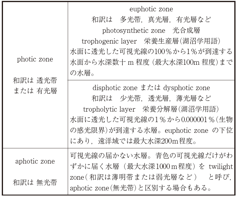 海洋表層において太陽光が届く範囲の水深。有光層とも。生物の感光限界までの深さで,光合成による基礎生産が行われる。基礎生産による濁度の違いを反映して,海域によって水深が異なり,透明度が比較的高い遠洋域では最大水深200m程度。透光帯または有光層のうち,特に最表層で太陽光が十分に供給され,合成による有機物生産が呼吸による分解を上回る水深数十m程度(最大水深100m程度)までの部分を真光層もしくは多光帯(euphotic zone)と呼ぶ。この真光層を有光層と呼ぶこともある。また,その下位の部分を少光帯もしくは透光層(disphotic zoneまたはdysphotic zone)と呼ぶこともあり,用語の使用には注意が必要。