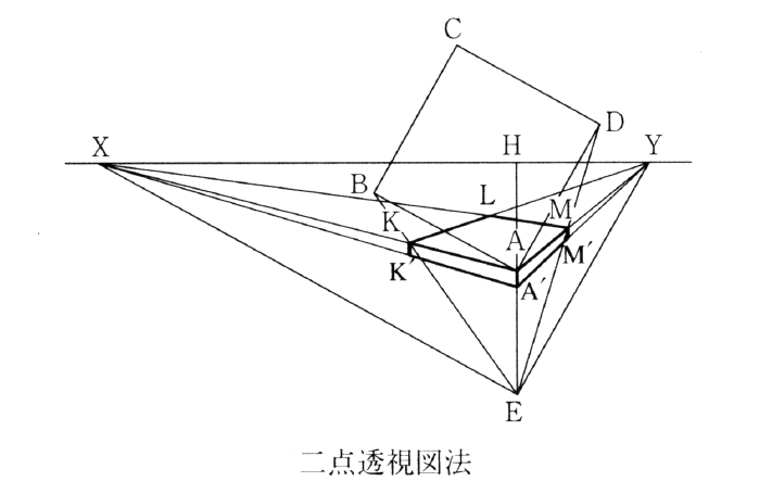 (1)ブロックダイヤグラムの作図法の一種。一般に二点透視図法が用いられる。画面に対して斜めに向いている原図形ABCDをまず描く。次に視点Eと目の高さHを定める。これによってブロックを眺め下ろす角度が決まる。Hを通る水平線XYを引き地平線とする。EからAB, ADに平行にEX, EYを引く。交点X, Yは焦点となる。XAとBE, YAとDEを結び,それぞれの交点をK, Mとする。XMとYKとを結び交点をLとすると,AKLMはブロックの透視図となる。これを地形図上の各範囲ごとに行えばよい。X, Yの2点をいずれか1点に収斂