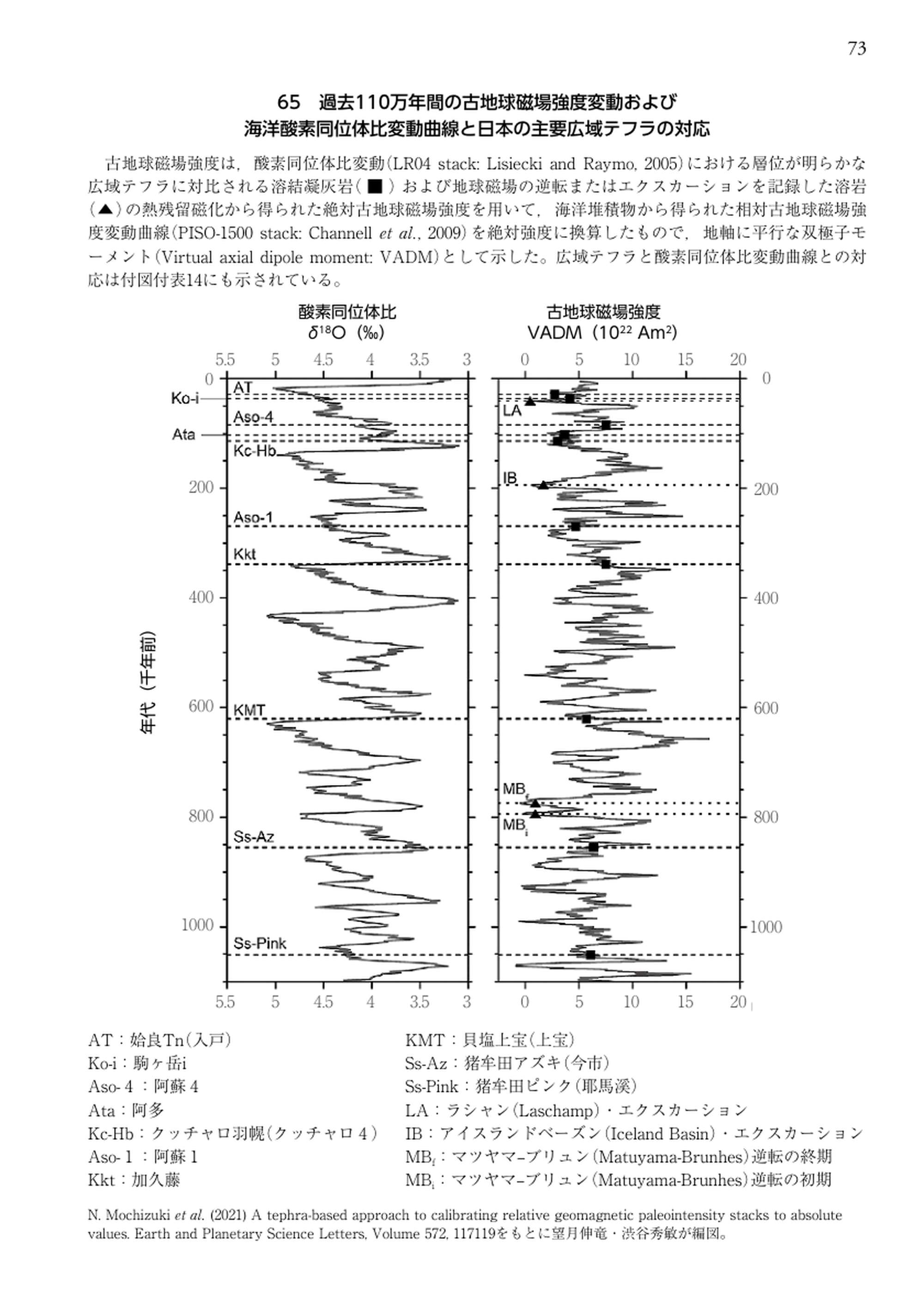 過去110万年間の古地球磁場強度変動および海洋酸素同位体比変動曲線と日本の主要広域テフラの対応