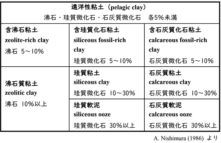 陸地から遠く離れた深海底の堆積物の総称で,軟泥と粘土に分けられる。深海堆積物とも。主要な構成要素は,種々の起原の粘土鉱物,生物起原の炭酸カルシウム(有孔虫殻,グロビゲリナ,コッコリスなど),生物起原のシリカ(放散虫殻,珪藻殻など),細粒の火山砕屑物,続成起原の沸石など。多少の風成塵・宇宙塵なども含まれる。生物起原物質や火山砕屑物の含有量がわずかなものは,堆積速度がきわめて小さく1,000年に1mm程度ないしそれ以下。分類の一例であるが,顕微鏡下での組成分析によって表のように分類される。