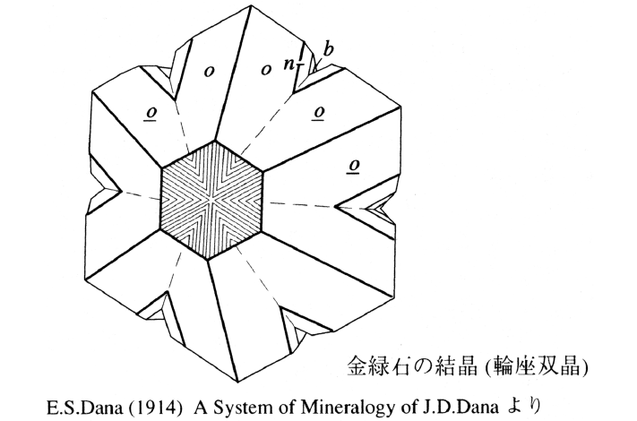 酸化鉱物。宝石鉱物の一つでもある。別称をクリソベリル(略してクリソ)という。また太陽光と白熱光で色が異なるものをアレキサンドライトという。橄欖(かんらん)石族鉱物と同構造。少量のチタン(Ti)を含むものについては、これが微細な金紅石の含有物によるものとされている。自形は六角形に近い輪郭をもった板状、あるいは双晶により複六角錐(すい)台、一方の尖(とが)った五角板状をなす。花崗(かこう)岩質ペグマタイト、黒雲母(うんも)片岩中に産し、石英、長石、白雲母、緑柱石、鉄礬(てつばん)ざくろ石などと共存する。日本では福島県須賀川(すかがわ)市雲水峰(うずみね)や同県石川町などから産する。英名の語源はギリシア語で「黄金色のベリル(緑柱石)」に由来する。なお、猫目石は星芒(せいぼう)(光芒ともいう。直線的に二方向へ走って光る筋(すじ))を示す金緑石である。