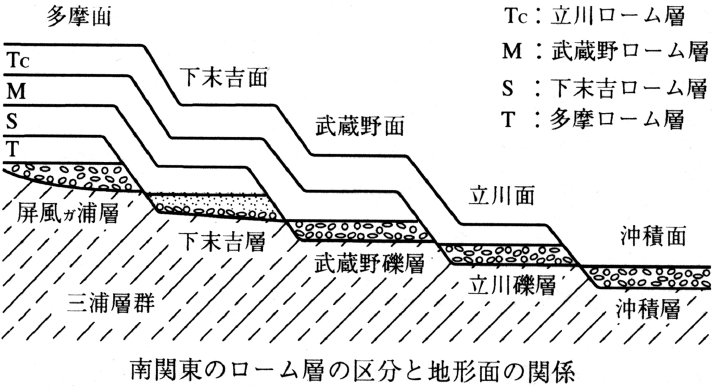関東ローム層は、堆積している河成段丘海成段丘の形成時代順にいくつかの層準の地層に区分される。南関東では古いほうから、多摩ローム、下末吉ローム(しもすえよしろーむ)、武蔵野ローム(むさしのろーむ)、立川ロームの4層に区分されている。
