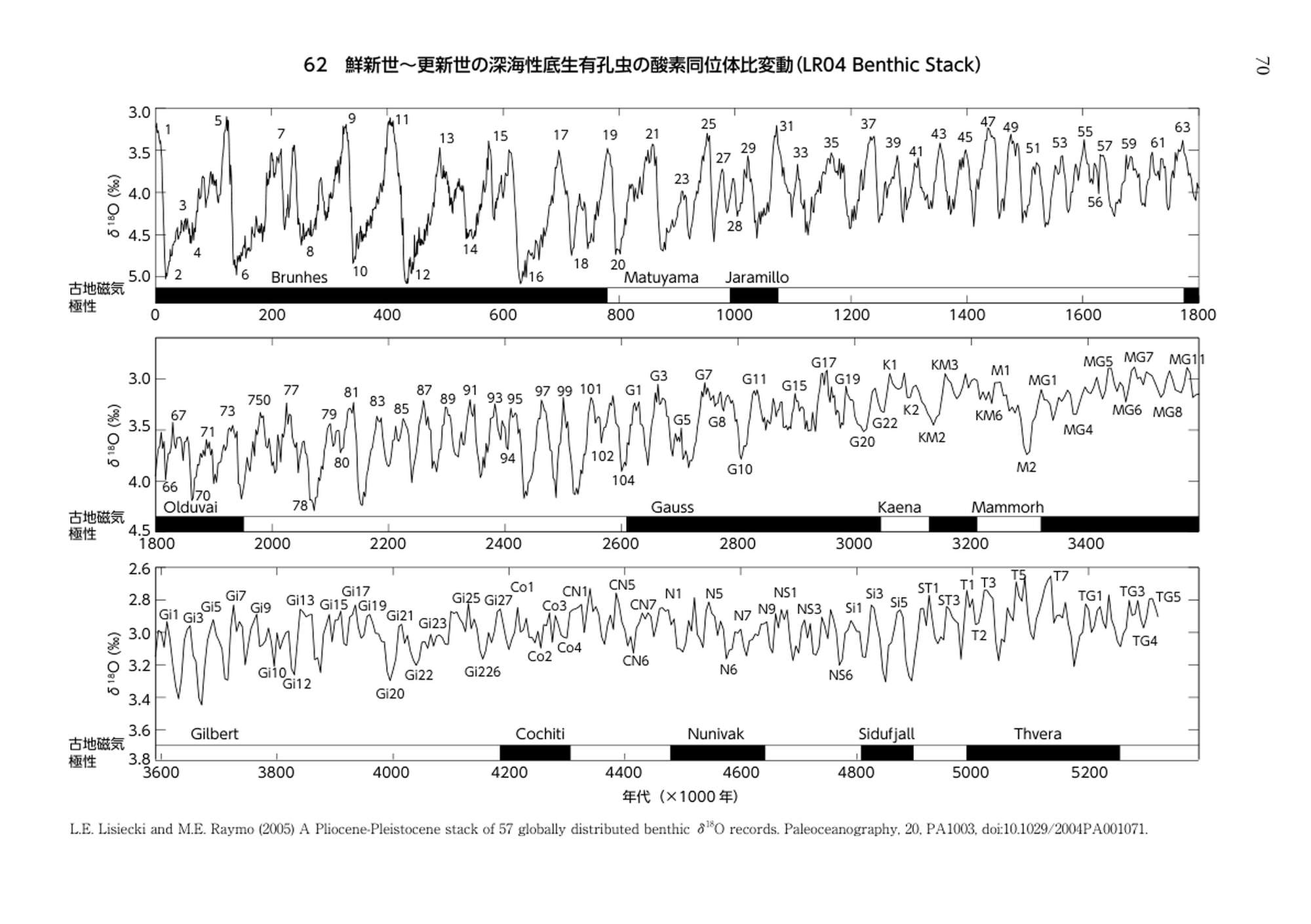 最新 地学事典に掲載されている「鮮新世~更新世の深海性底生有孔虫の酸素同位体比変動(LR04 Benthic Stack)」をご覧になれます。詳細については、画像をクリックして拡大し、ご覧ください。