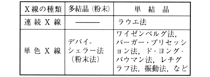 鉱物その他の結晶質試料をX線にかけ,その回折X線をフィルムまたはイメージングプレート検出器などに記録する装置。使用X線および試料の種類によって表のようになる。ラウエ法は結晶の対称を調べることに用いられ,デバイ─シェラー法その他が一般に広く用いられている。