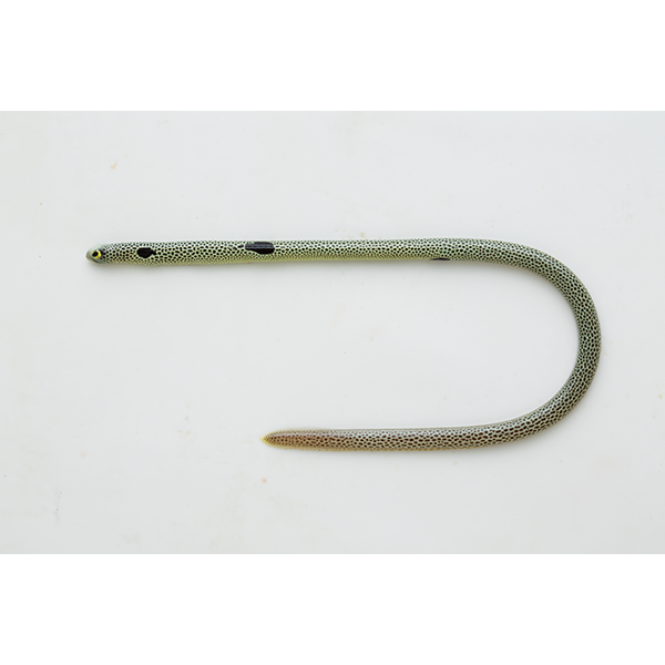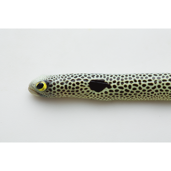 硬骨魚綱ウナギ目アナゴ科チンアナゴ亜科に属する海水魚。静岡県富戸(ふと)、高知県柏島(かしわじま)付近の太平洋沿岸、屋久島(やくしま)、南西諸島、小笠原(おがさわら)諸島、台湾南部、フィリピン、マダガスカルなどのインド洋・太平洋に広く分布する。いわゆるガーデンイールの一種。左右の上唇の遊離縁は吻端(ふんたん)でつながり、前鼻孔(ぜんびこう)と感覚孔は遊離縁上に開くことでチンアナゴ属に属し、シンジュアナゴ属と明瞭(めいりょう)に区別できる。体はきわめて細長い。肛門(こうもん)は全長の前38~41%付近に開く。頭は小さく、肛門前長(吻端から肛門までの長さ)のおよそ14~17%。上下両顎(りょうがく)の歯は広い歯帯で、上顎の後端部のものはいくぶん大きい。鋤骨歯(じょこつし)(頭蓋(とうがい)床の最前端の骨にある歯)は前上顎骨歯とつながり、後方に向かって狭くなる歯帯を形成する。全側線孔数は158~172個で、そのうち、肛門よりも前に59~64個が開く。背びれは鰓孔(さいこう)のすこし前から始まる。胸びれは小さく、頭長の6.2~9.1%。体の前3分の1は全体に灰色~紫褐色で、腹方と尾部ではより淡い。体全体に丸い暗色斑(はん)が狭い間隔で規則的に配列するが、この斑点が連結する個体もある。鰓域は淡褐色。背びれと臀(しり)びれは一様に透明で、斑紋がない。眼径より大きく、よく目だつ3個の黒色斑紋があり、最前のものは鰓孔と胸びれを取り囲み、2番目のものは躯幹(くかん)部(胴部)の中ほどに、最後のものは肛門を取り囲む。稚魚では体は全体に黒くて、本種の特徴的な三つの黒斑は目だたない。最大全長は約40センチメートル。水深7~50メートルのサンゴ礁近くのサンゴ砂中に潜り、体の前半分ほどを出して水流に向かい流れてくるプランクトンなどを食べる。通常はコロニーを形成し、数百個体が見られることもある。ダイバーによってよく観察・撮影され、体の特徴的な斑紋によって容易に他種と区別できる。