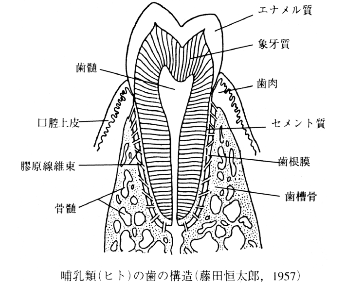 脊椎(せきつい)動物の口腔(こうこう)内にある消化器官の付属体の一つ。無脊椎動物にも「歯」とよばれる器官があるが、厳密な意味での歯とは脊椎動物のもののみをさす。しかし脊椎動物でも、ヤツメウナギなどの円口類や無尾両生類のオタマジャクシなどの歯状物は、表皮の角質形成物であって真の歯とは異なり、角歯(かくし)とよばれる。真の歯は内部に繊維性結合組織の歯髄をもち、それを囲んで真皮性の歯質(象牙質(ぞうげしつ))がある。歯髄には血管と神経が入り込んでいる。歯髄が満たす腔所を歯髄腔という。口腔に露出する部分は、表皮性のエナメル質からなり、歯冠という。硬骨魚類以上では歯の基部(歯根)はセメント質で覆われている。歯はこのように硬質な器官であるために、化石として残りやすく、化石となった歯は脊椎動物の進化を推定するのによく利用される。